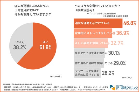 「痛みが悪化しないように、日常生活において何か対策をしていますか?」と質問したところ、約6割の方が『はい(61.8%)』と回答しました。