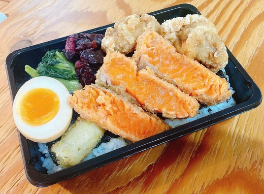 ・「ネギ塩ダレの唐揚げ海苔弁当」750円から人気の「サーモンのレアカツ海苔弁当」1,200円などが楽しめる店舗。