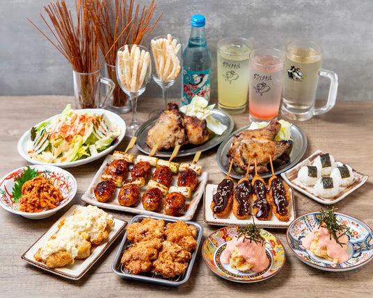 とまらん棒、カリカリチーズスティック、親鳥チャンジャ、鶏生ハムとクリームチーズのサラダ、鶏串カツ 味噌、金賞からあげもも、南蛮タルタル塩麹むね、がブリ串つくねぎま(タレ焼き)、タラモサラダ、骨付鳥ひな、骨付鳥専用ひとくち小むすび