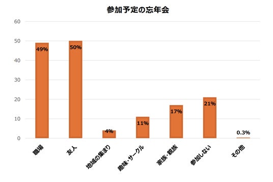 その中でも特に「職場の忘年会」(49%)と「友人との忘年会」(50%)が高い割合を示し、仕事納めや友人との1年の振り返りの場としてのニーズが根強いことが伺えます(複数回答可)。