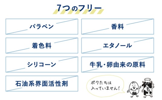 パラベン / 香料 / 着色料 / エタノール / シリコーン / 牛乳・卵由来の原料 / 石油系界面活性剤