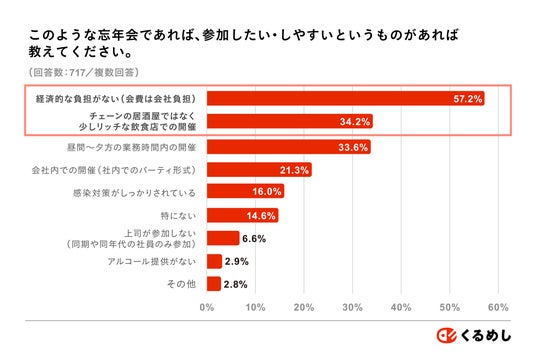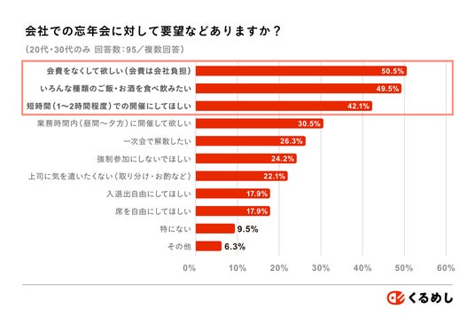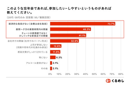 さらに、20代・30代に回答を絞ると、「経済的な負担がない」は73.7%に、「昼間~夕方の業務時間内の開催」は46.3%、「チェーンの居酒屋ではなく少しリッチな飲食店での開催」が41.1%と割合が高くなっています。