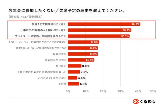一方で、「忘年会に参加したくない・欠席予定」の理由としては、「夜遅くまで拘束されたくない(40.8%)」「仕事以外で職場の人と関わりたくない(36.2%)」「プライベートや家族との時間を優先したい(35.1%)」という回答がみられ、社内コミュニケーションに消極的な人も多いことがわかります。