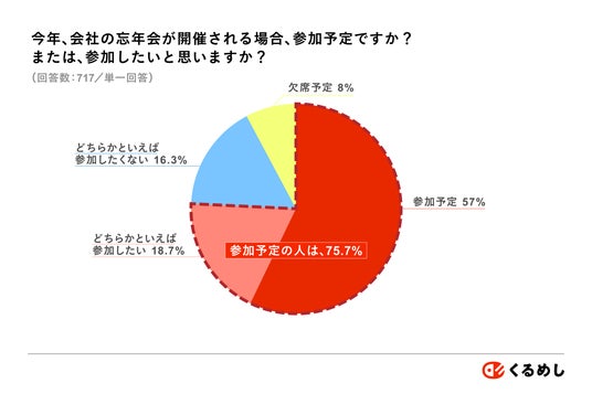 今年の忘年会について、参加の意向有無を聞いたところ、57%が「参加予定」、18.7%が「どちらかといえば参加したい」と回答し、全体で75.7%が忘年会への参加予定であることがわかりました。