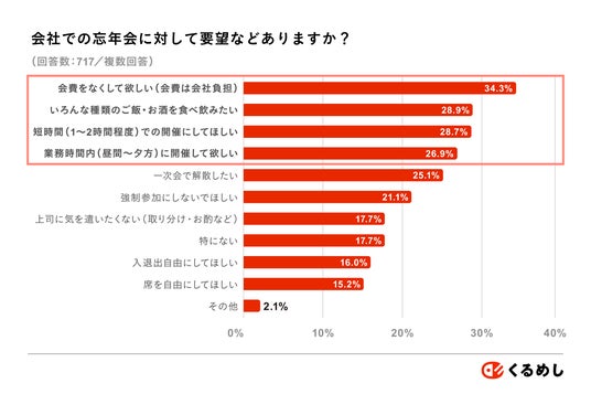 ● 忘年会に対する要望No.1は「会費をなくして欲しい(34.3%)」No.2は「いろんな種類のご飯・お酒を楽しみたい(28.9%)」、No.3が「1~2時間の短時間での開催にして欲しい(26.9%)」