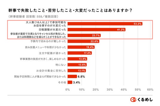 ● 幹事経験者の50%以上が「お店探し」に苦戦し、40%以上は「日程調整」に苦労した経験あり