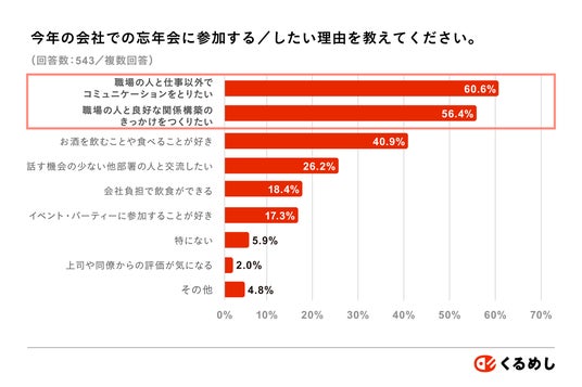 「会社の忘年会に参加予定・参加したい理由」を聞いたところ、「職場の人と仕事以外でコミュニケーションを取りたい(60.6%)」「忘年会を通じて職場の人と良好な関係構築のきっかけを作りたい(56.4%)」という回答がみられ、忘年会が社員同士のコミュニケーションのきっかけの1つとなっているようです。