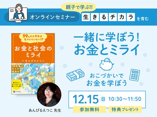 株式会社増進会ホールディングス(Z会グループ)のグループ会社、株式会社Z会ソリューションズは、「一緒に学ぼう! お金とミライ ~おこづかいでお金を学ぼう~ 」(参加無料)と題したオンラインセミナーを2024年12月15日(日)に開催します。