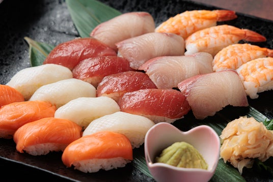 にぎり寿司(ブリ、エビ、イカ、サーモン、漬けマグロ)