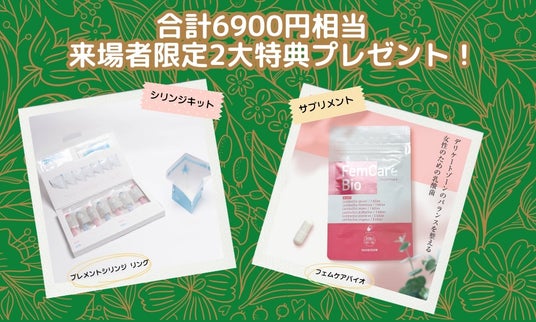 6900円相当のプレゼントをご用意!ご来場者様限定で、株式会社オンリースタイルのシリンジキット「プレメントシリンジ リング」(1500円相当)と、株式会社nurse cureのサプリメント「フェムケアバイオ」(5400円相当)を全員にプレゼント致します!是非、ご自身の妊活にお役立てください。