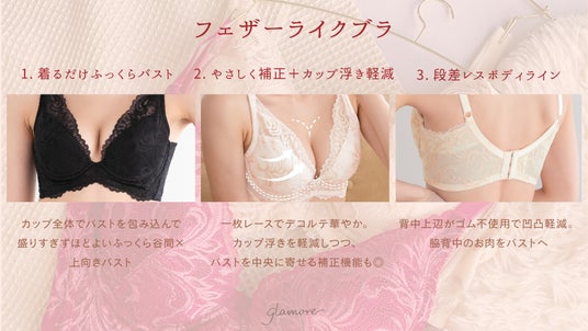 シリーズ累計販売132万枚を突破した「グラモアブラ」の“自胸だけで谷間”ができるパターンをベースに、フルカップ風にカップレースで包み込むことで、ナチュラルな「ふんわり谷間」を実現。加齢によってバストが下がってしまった…という人もナチュラルな「上向きバストシルエット」を実感できます。