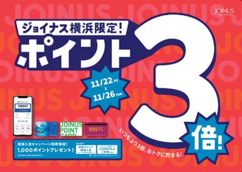 ジョイナスでのお買い物・お食事で、通常の3 倍のポイントがたまるおトクなキャンペーンを開催します。いつもよりおトクなこの期間にぜひジョイナスでのお買い物、お食事をお楽しみください。
