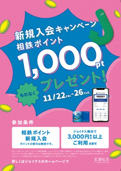 【内容】期間中、相鉄ポイント新規入会の方に限り、ジョイナスで3,000円以上(税込・合算可)ご利用いただくと、相鉄ポイント1,000ポイントをもれなくプレゼントします。