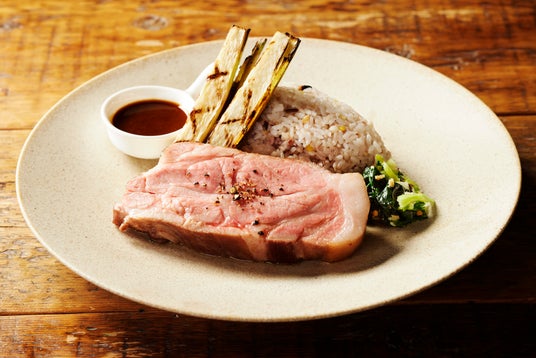 溶岩石グリルで豪快に焼き上げた“仙高ポーク”200gに、芳醇な香りと上品な甘さが特徴の愛媛産麦味噌ソースを添えました。オリジナルスパイスをまぶしたマコモタケの香りと食感が料理のアクセントになります。