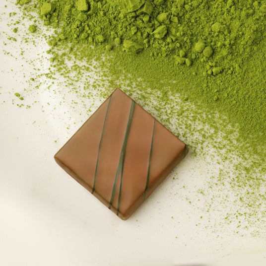 プラリネ・抹茶 控えめにローストしたヘーゼルナッツとアーモンドのプラリネに西尾抹茶を合わせ、さらにカカオバターに抹茶をアンフュゼすることで、コクと抹茶の風味を最大限に引き出しました。