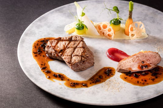 トリュフの芳醇な香りのソースで味わう「和牛ロース肉のグリエ 河内鴨のロースト トリュフソース」