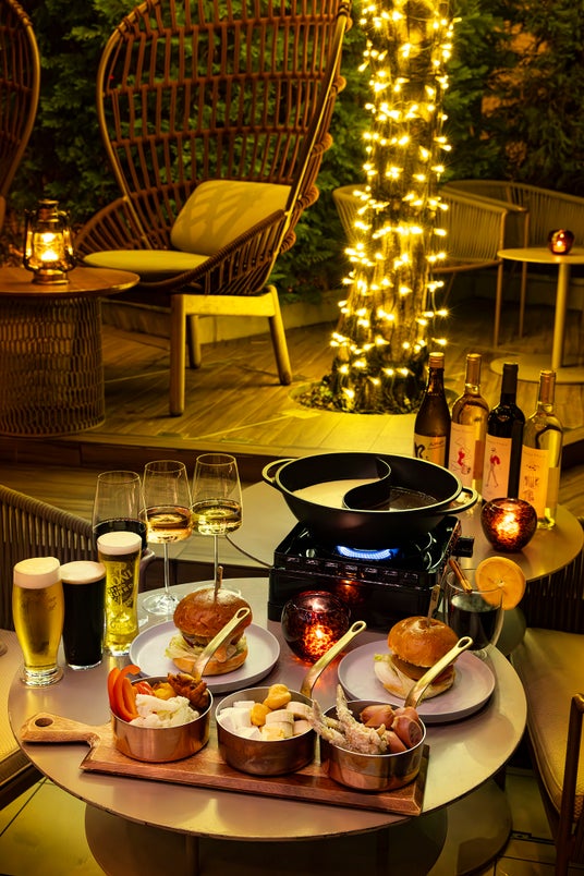 今年のディストリクト ブラッスリー・バー・ラウンジのウィンターテラスは、オレンジ色の灯がともったキャンドルライトガーデンに。あたたかいストーブの下でブランケットにくるまりながら、熱々の鍋やフォンデュを楽しめるプランをご用意しました。部屋にこもりがちな冬こそ、テラスに出てリフレッシュ!心まで温まるCozyでゆったりとした時間をお過ごしください。
