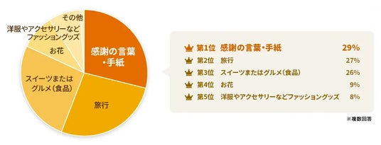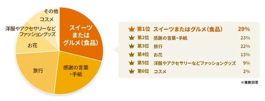 1位がスイーツまたはグルメなどの食品、2位が感謝の言葉・手紙、3位が旅行