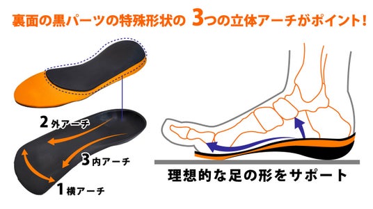 1.アーチのサポート内アーチ+中足骨をしっかりと支えることで骨盤の傾きをサポート