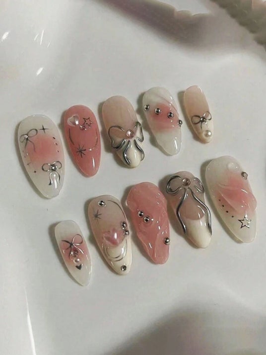 商品名:中サイズのアーモンド型のネイル24個入り、キャットアイとバレエスタイルのハイグレイズブリング、3Dパール、リボン、ハート、透明な3D不規則なウェーブ模様とブリングシルバー、シークイン、ラインストーン、オレンジピンクのフルカバーフェイクプレスオンネイルキット