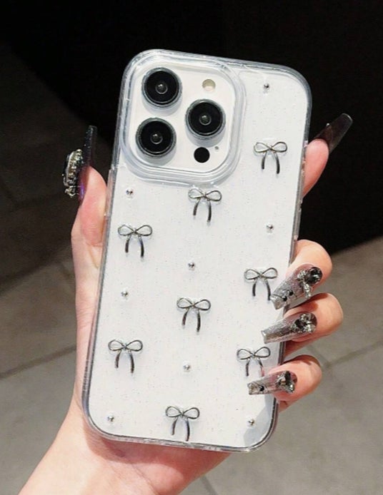 商品名:エステティックでシンプルなシルバーテクスチャ 小さなリボン&メタル小さな丸ビーズ トランスペアレントエポキシ iPhoneケース