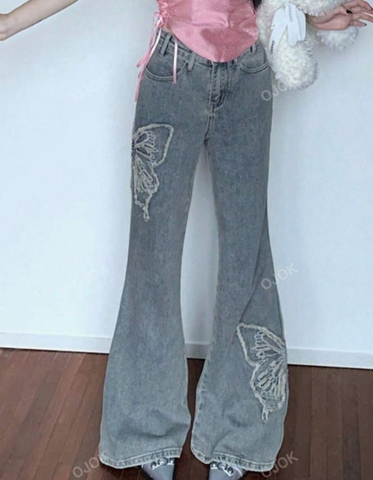 商品名:フレアジーンズ バタフライ&アップリケ ゆったり ほつれ加工