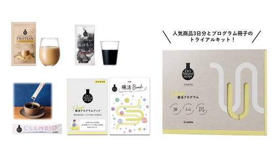 この度、「ドクターズナチュラルレシピ」は、「ドクターズナチュラルレシピ トライアルキット 3日間腸活※プログラム」を 数量限定で発売いたします。トライアルキットでは、ドクターズナチュラルレシピの人気3商品である「ボタニカルライ フプロテイン(きなこ味)」「サポート酵素ドリンク(りんご味)」「クレンビオ 乳酸菌パウダー」の個包装が3個ずつ入った セットをご用意いたしました。また、商品を手軽にお試しいただけるだけでなく、同梱の「腸活BOOK」や、管理栄養 士・姿勢改善トレーナー監修の「3日間腸活※プログラムブック」を併せて活用いただくことで、腸内環境の基礎や食 事の選び方、美腸に導くトレーニングの知識も身に付けることができるセットとなっております。 “はじめての腸活※”としても簡単に取り組んでいただけるよう、各商品をお召し上がりいただくタイミングや、管理栄 養士によるおすすめの食事の選び方など幅広くご提案します。トライアル中の3日間で、腸内環境の変化を少しで も感じていただけるようにサポートいたします。