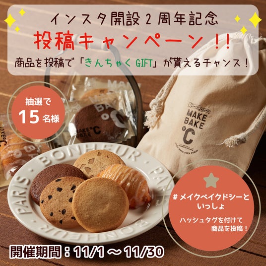 感謝の気持ちを込め、「プレゼントキャンペーン」を開催中です。MAKE BAKE℃の商品を投稿していただいた方の中から抽選で15名様に「きんちゃくGIFT」をプレゼントいたします。
