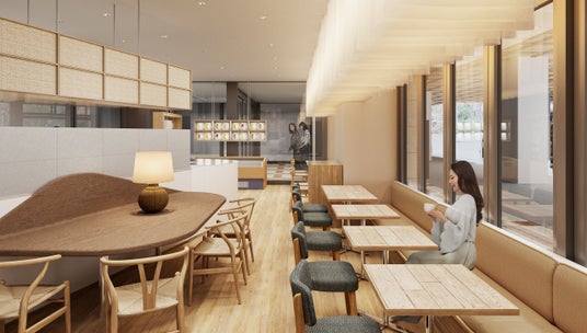 バスターミナルを明るく照らす「百の布のともしび照明」、「麻生」「柿生」にちなんだ素材のセレクト、「万福寺」から着想したふっくら柔らかい「まんぷくソファ」など、新百合丘の街にインスピレーションをもらいながら作り上げた店舗です。