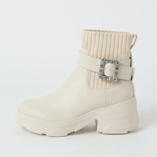 カジュアルに見えがちなワークブーツも、プラスダイアナらしいまろやかなアイボリーカラーと、クリスタルバックルの組み合わせで大人フェミニンな印象に仕上げました。