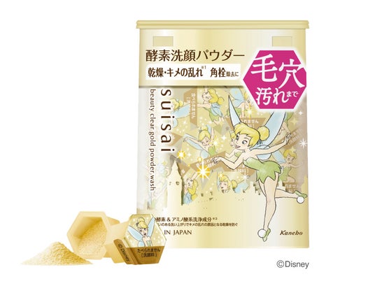 カネボウ化粧品の洗顔専門ブランド「suisai beauty clear(スイサイ ビューティクリア)」は、10年連続売上No.1※1 シリーズの酵素※2洗顔パウダー「スイサイ ビューティクリア ゴールド パウダーウォッシュ」より「ティンカー・ベル」デザインの限定パッケージを、2024年11月16日(土)より数量限定で発売いたします。