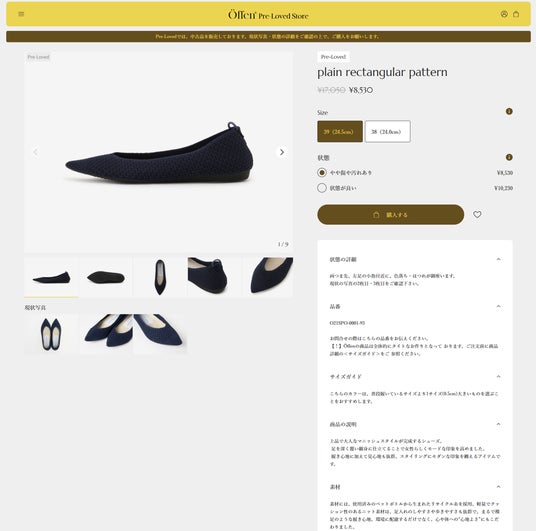 『Öffen Pre-Loved Store』では、お客様の購入を素敵な体験にするべく、Pre-Lovedシューズの現状写真に加え、新品時の写真/商品情報も掲載していることや、別のサイズ/価格のシューズを、同じ画面で確認頂けるようなページ構成となっております。