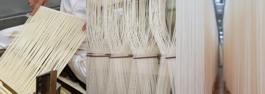 二種類のオリジナル小麦粉をブレンドし、製造工程で何度も捻りをかけ伸ばした後、しっかり熟成させることで強いコシとのどごしの良さを実現した、マル勝高田のこだわりの製法。