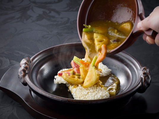 自家製のカレーソースで蓮根、紅芯大根、シャドークイーン、インカの目覚め、人参、カブなどの根菜を煮込み、香ばしく揚げたおこげにかけました。野菜たっぷりのボリュームある一品です。
