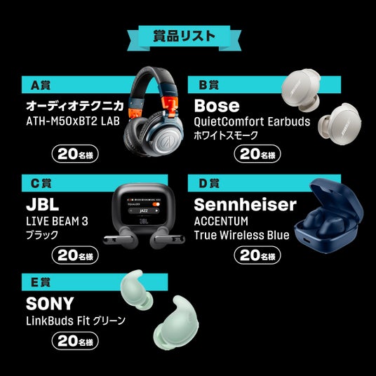 Amazon Musicで「BEST OF 2024 Best Artists」、「BEST OF 2024 J-Pop」、「BEST OF 2024 K-Pop」のいずれかのプレイリストを聴いた方の中から抽選で合計100名様に音楽を楽しむためのアイテムとして、メーカー5社(Audio-Technica、BOSE、JBL、Sennheiser、SONY)のヘッドホンなどをプレゼントするキャンペーンを実施します。