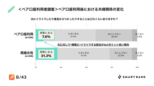 夫に「“頻繁に”イライラ」する割合は、“ペア口座”利用している妻が13.7ポイント低い傾向