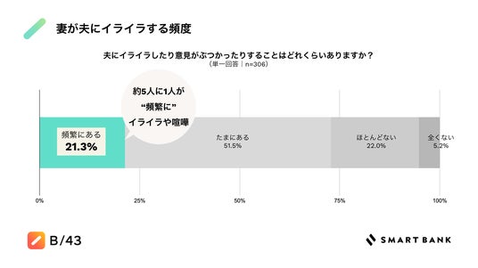 夫にイライラしたり意見がぶつかったりする頻度を質問したところ、21.3%が「頻繁にある」と回答し、約5人に1人の妻が夫に対して“頻繁に”イライラしたり喧嘩が発生していることが分かりました。