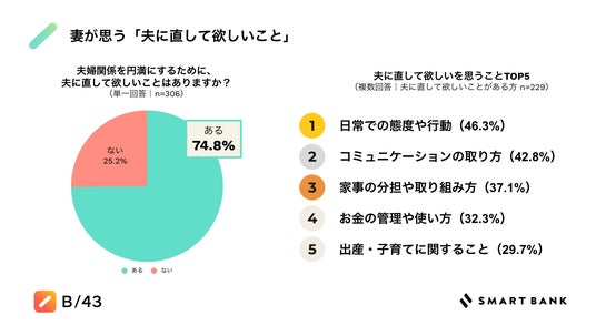 74.8%の妻が、「夫に直して欲しいことがある」と回答