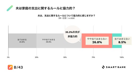また、支出に関するルールについて夫が協力的だと感じるかを質問したところ、26.8%が「やや当てはまらない」、8.5%が「当てはまらない」と回答し、合わせて35.3%が、「夫が家庭における支出に関するルール順守に非協力的」だと感じていることが分かりました。