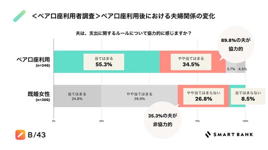 また、夫が支出に関するルールについて協力的に感じるかどうかを比較すると、既婚女性では、合わせて35.3%が「夫が家庭における支出に関するルール順守に非協力的」、64.7%が「夫が家庭における支出に関するルール順守に協力的」と感じているのに対し、ペア口座利用では、「当てはまる」(55.3%)、「やや当てはまる」(34.5%)、合わせて89.8%が「夫が家庭における支出に関するルール順守に協力的」だと感じていることが分かりました。
