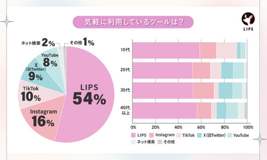 複数の媒体を横断的に利用するのが当たり前となった今。なかでもより気軽に使用しているSNSについて聞いてみたところ、LIPS(54%)、Instagram(16%)、「TikTok」(10%)という結果に。