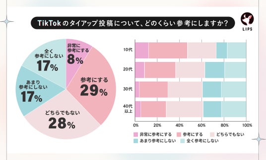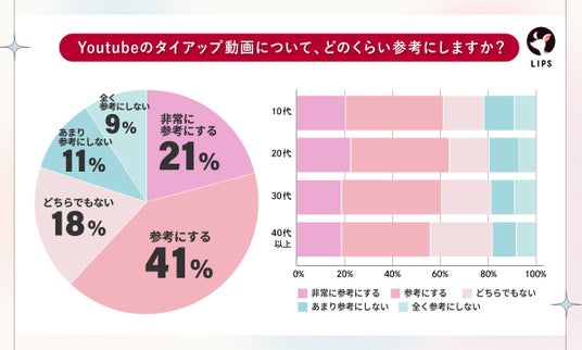 「TikTok」のタイアップ動画について、「非常に参考にする」「参考にする」と答えたユーザーは全体の約40%程度ほど。右側のグラフをみると、若年層ほど参考にしている人の割合が多いことがわかります。
