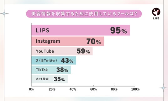 美容収集をする際に頻繁に使用されているのが「LIPS」(95%)でした。続いて「Instagram」(70%)、「YouTube」(59%)と続く結果に。