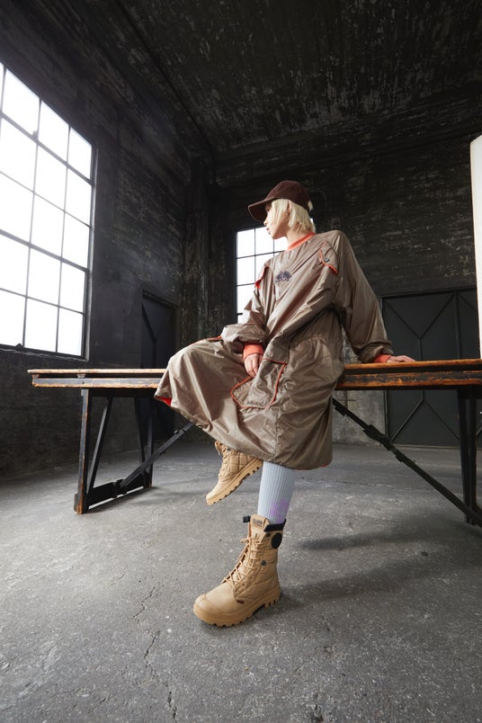 PALLADIUM(パラディウム)は、航空機専用のタイヤメーカーとして1920年代にフランスで創業。第二次世界大戦後、その技術を応用しラバーソールブーツの製造をスタート。フランス軍より、砂漠地帯で使用する軍靴というリクエストを受けて、デザートブーツの原型ともいわれる、ブランドのアイコン「PAMPA(パンパ)」シリーズが誕生。70年の歴史を経て、オーセンティック感と特徴的なソールに加え、最先端のデザインを合わせ持つフランス発ブーツスニーカーブランドとして、世界80ヶ国で展開しています。
