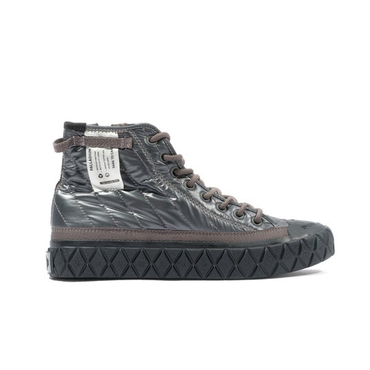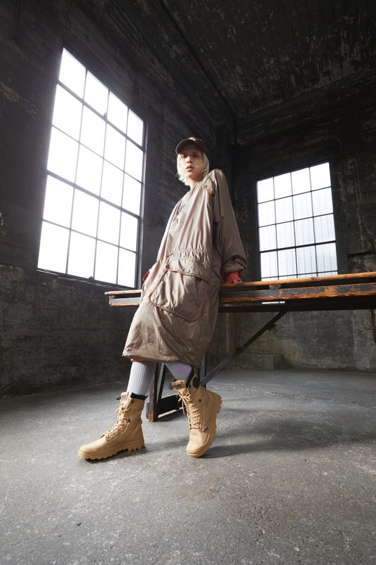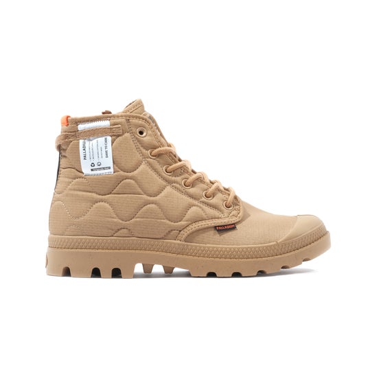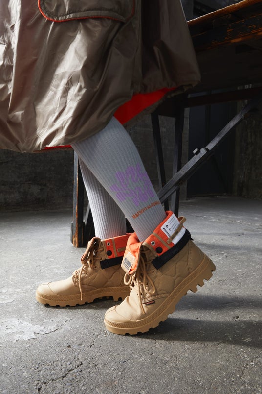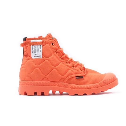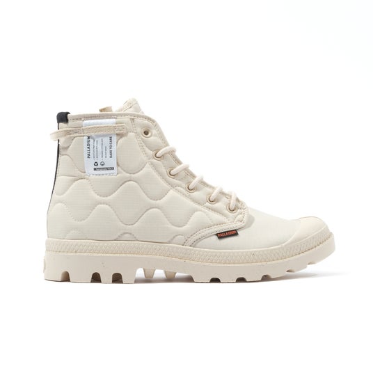 アッパーにあしらった中綿キルティング加工に加え、踵周りに施したヘリンボーン織の踵ストラップやケアタグをデザインとして採用するなど、こだわりのギミックと共に環境に配慮したパラディウムらしい1足に。アッパーのキルティングや中綿にはリサイクルナイロン、シューレースにはオーガニック、またはリサイクルコットン、ソールにはリサイクルラバーを使用しています。