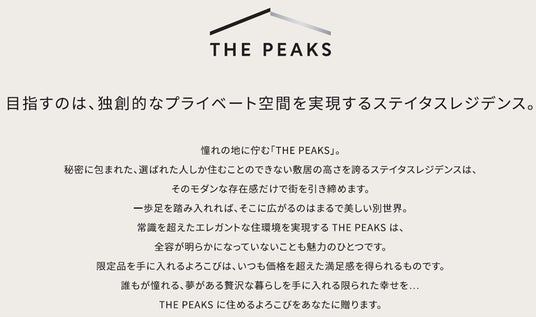 THE PEAKSは「独創的なプライベート空間を実現するステイタスレジデンス」をコンセプトとしたラグジュアリー賃貸マンションです。ラグジュアリーであり、エンターテイメントでもある「THE PEAKS」は、ハイブランドや、スポーツカーあるいはフラッグキャリアのファーストクラスのように、誰もがその存在を知っている一方で、そこに触れ楽しむことが出来るのは一部の限られた人のみ、という限定ブランドです。常識を超えた間取りや優雅なインテリア、ゆとりある駐車スペースといった贅沢な暮らしは、そこに住まう人に深い充足感と優越感を約束します。