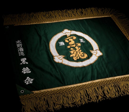 黒龍酒造が220周年を迎え、その記念に六代目、七代目、そして現代の八代目をイメージして三本の特別な酒が醸されました。そのラベルには、力強い筆の祓【はらい】を表現に用いました。上から下に向かって祓ったもの。左下から右上に向かって祓ったもの。右下から左上に向かって祓ったもの。それぞれ三種類の祓です。これは六代目の頃から使用されている黒龍の「三つ爪」マーク(画像下、社旗中央のマーク)の、それぞれの爪ではらった跡をイメージしています。三方向から龍の爪に支えられて黒龍酒造が歴史を刻み、それぞれの酒はその三つの爪でお祓いをされているかのように。そして、六代目が縦に一本柱を立て直し、七代目八代目がそれを支え、さらに洗練させてきたというイメージを重ねてラベルデザインを完成させました。