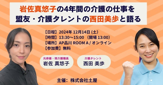 本イベントは元俳優・現介護職員の岩佐真悠子さんと介護タレントの西田美歩さんをお招きし、芸能界から介護の世界へと転身された経験についてお話しいただきます。会場での対面参加とオンライン参加のハイブリッド形式で実施いたします。