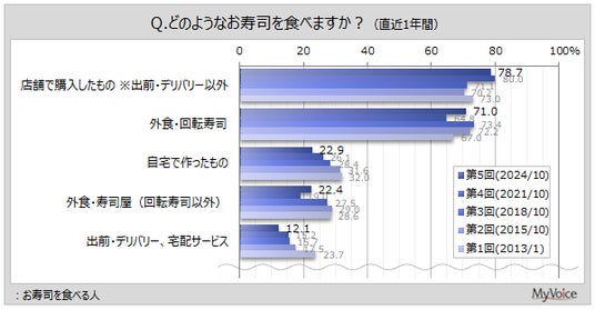 「店舗で購入したもの」が78.7%、「外食・回転寿司」が71.0%、「自宅で作ったもの」「外食・寿司屋」が各2割強となっています。「自宅で作ったもの」は、過去調査と比べて減少傾向です。