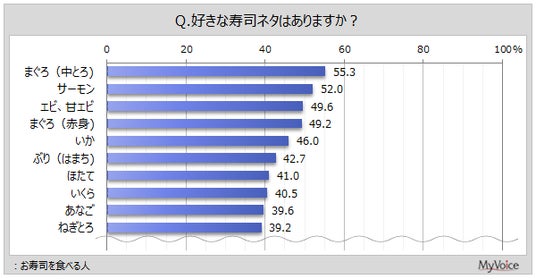 お寿司を食べる人が、好きなネタは(複数回答)、「まぐろ(中とろ)」「サーモン」が各50%台、「エビ、甘エビ」「まぐろ(赤身)」「いか」などが各40%台です。